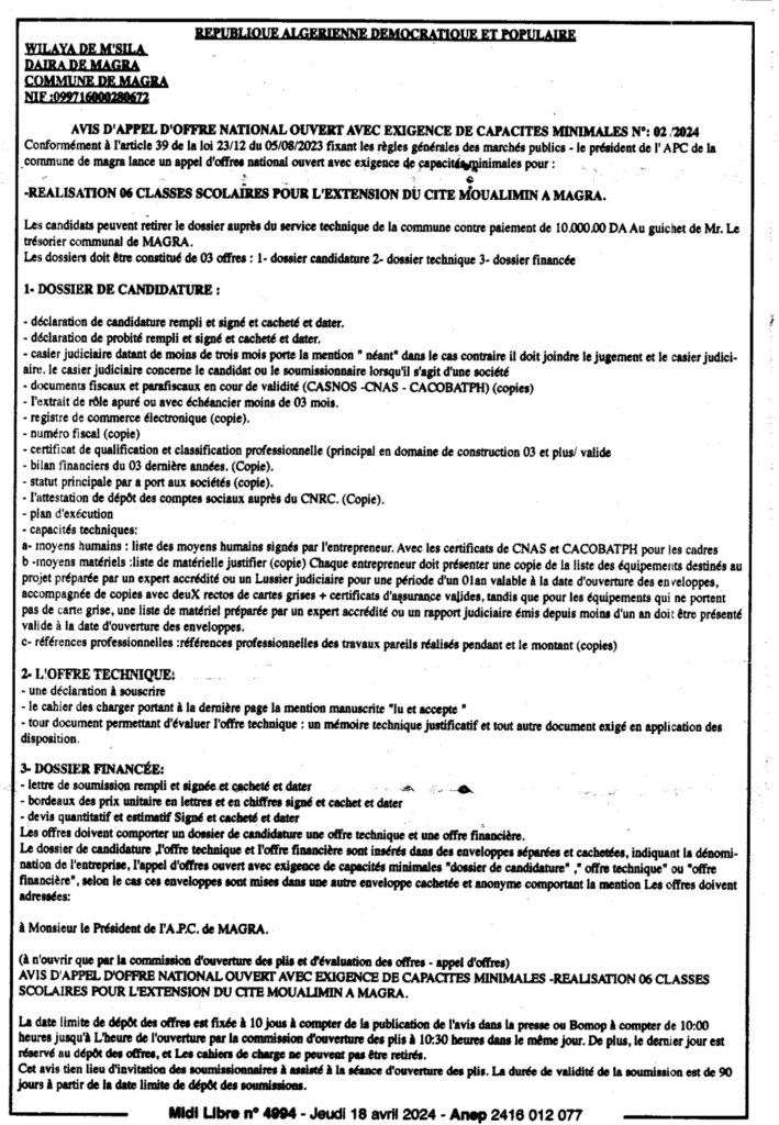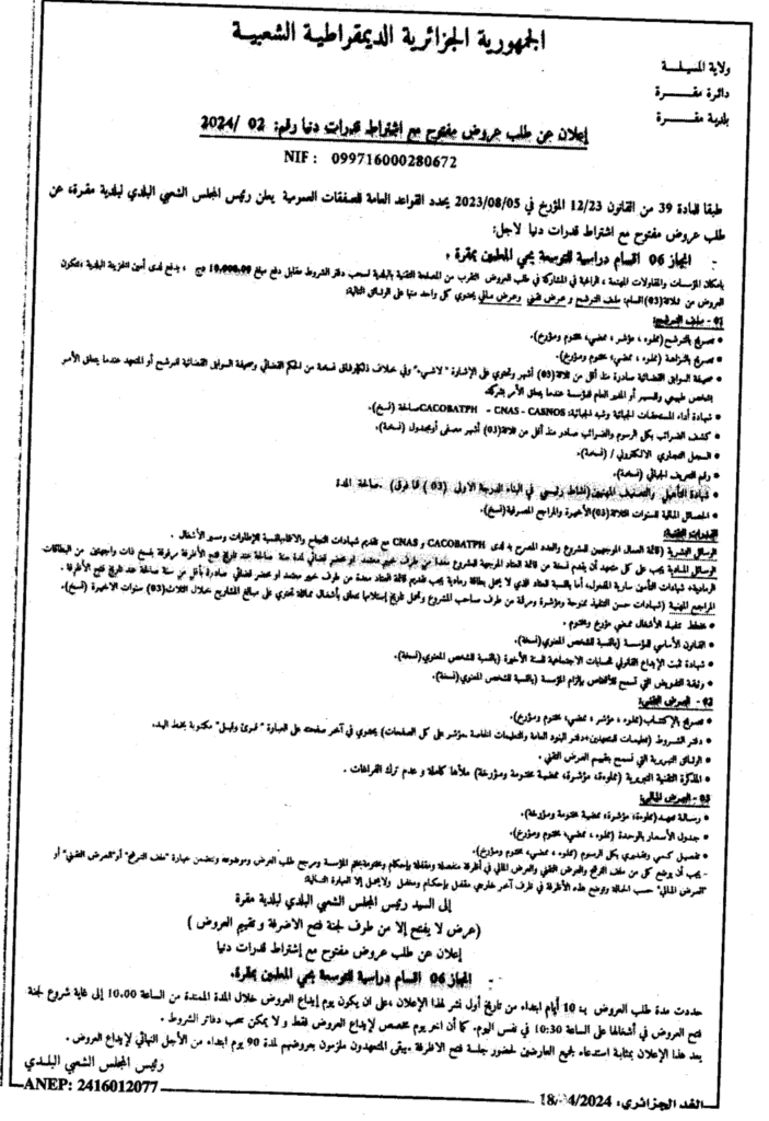 إعلان عن طلب عروض مفتوح 2024/02 بلدية مقرة