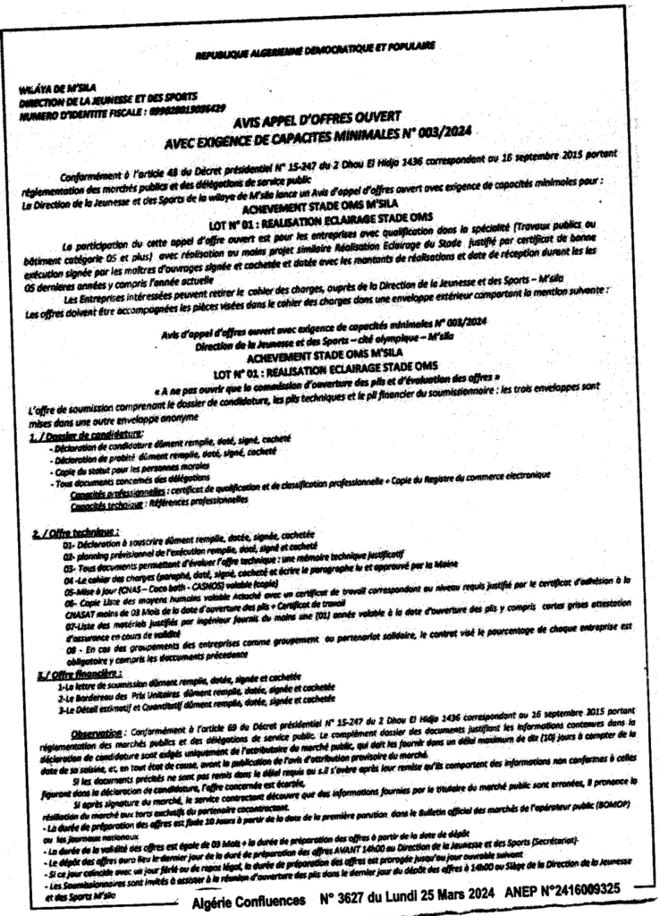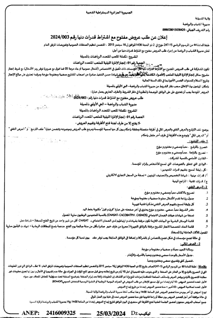 إعلان عن طلب عروض مفتوح 2024/03 مديرية الشباب والرياضة لولاية المسيلة