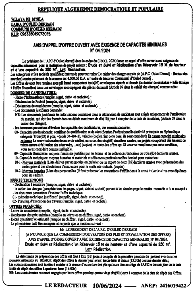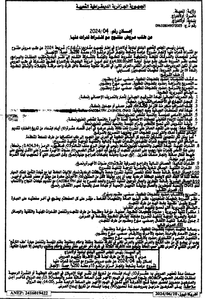 إعلان عن طلب عروض مفتوح 2024/04 بلدية أولاد دراج