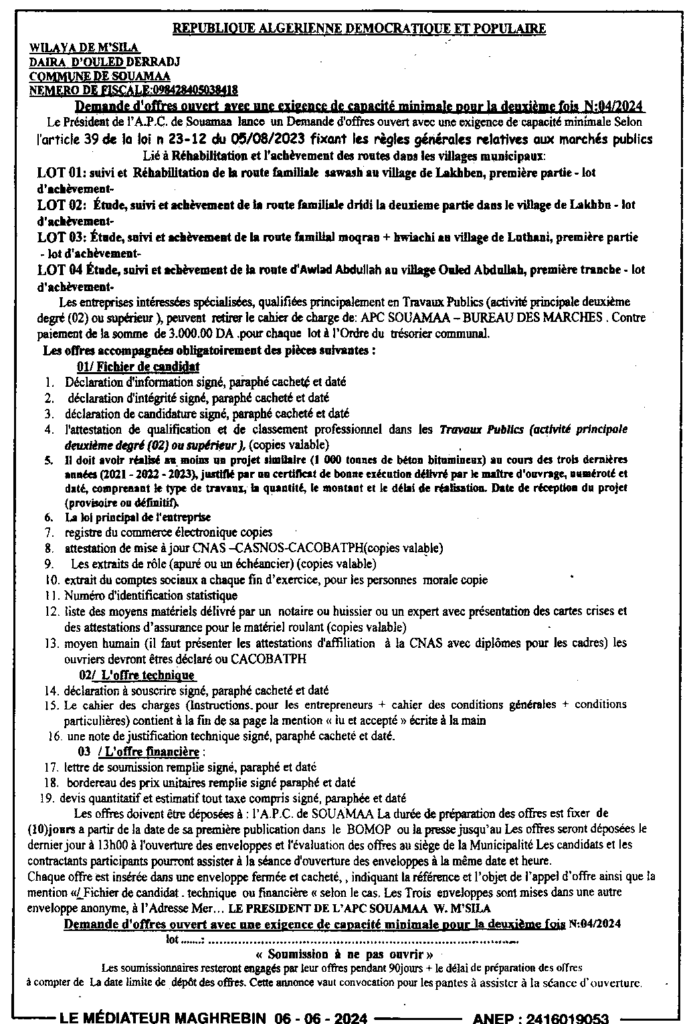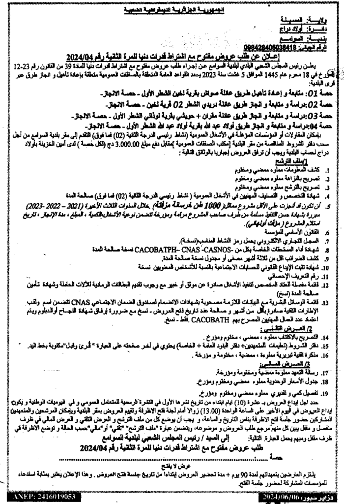 إعلان عن طلب عروض مفتوح 2024/04 بلدية السوامع