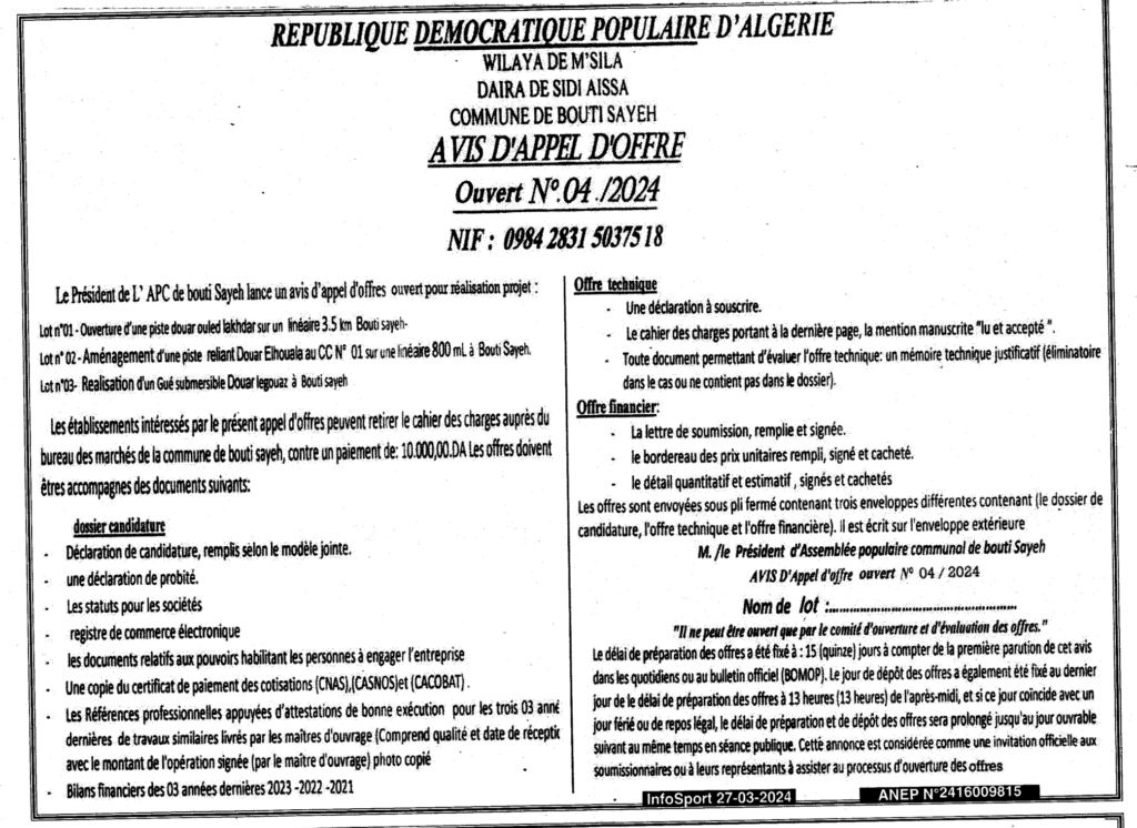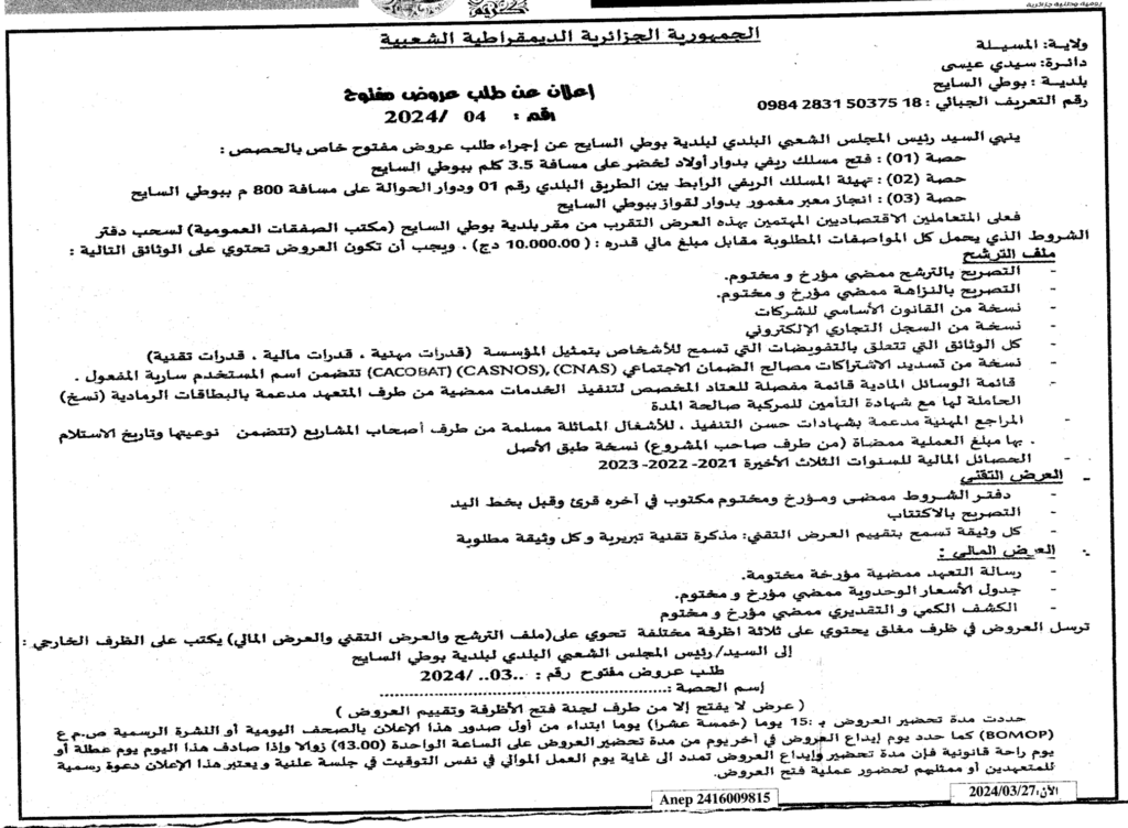 إعلان عن طلب عروض مفتوح 2024/04 بلدية بوطي السايح