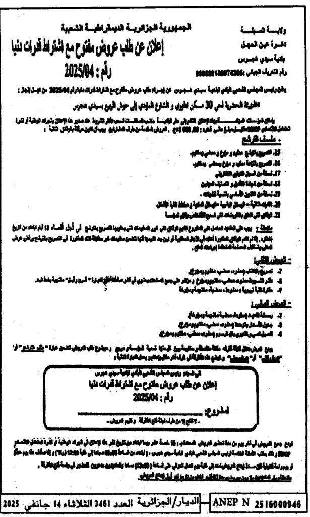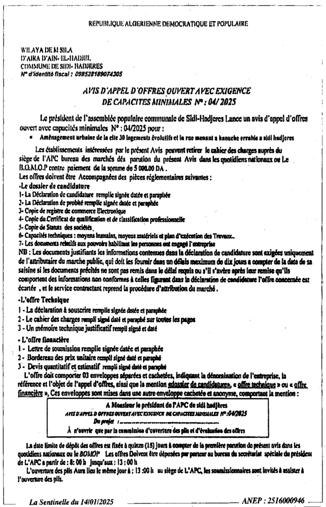 إعلان عن طلب عروض مفتوح 2024/04 بلدية سيدي هجرس