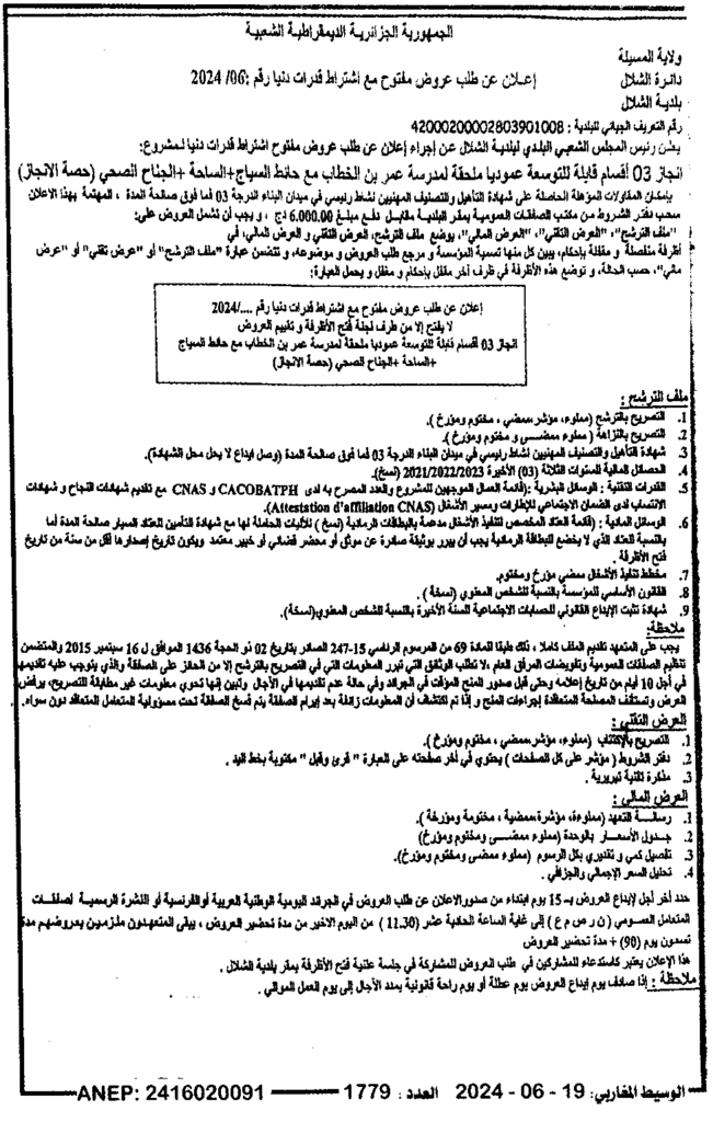 إعلان عن طلب عروض مفتوح 2024/06 بلدية الشلال