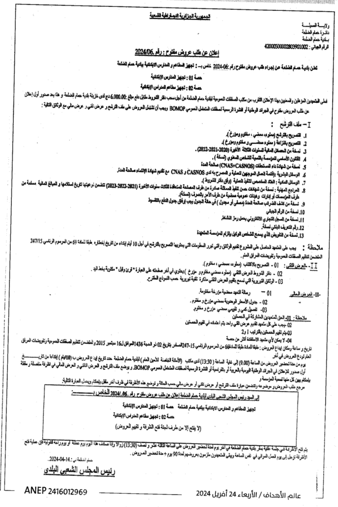 إعلان عن طلب عروض مفتوح 2024/06 بلدية حمام الضلعة