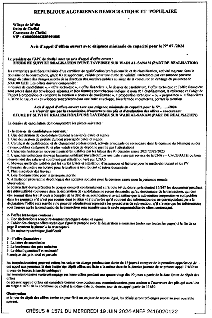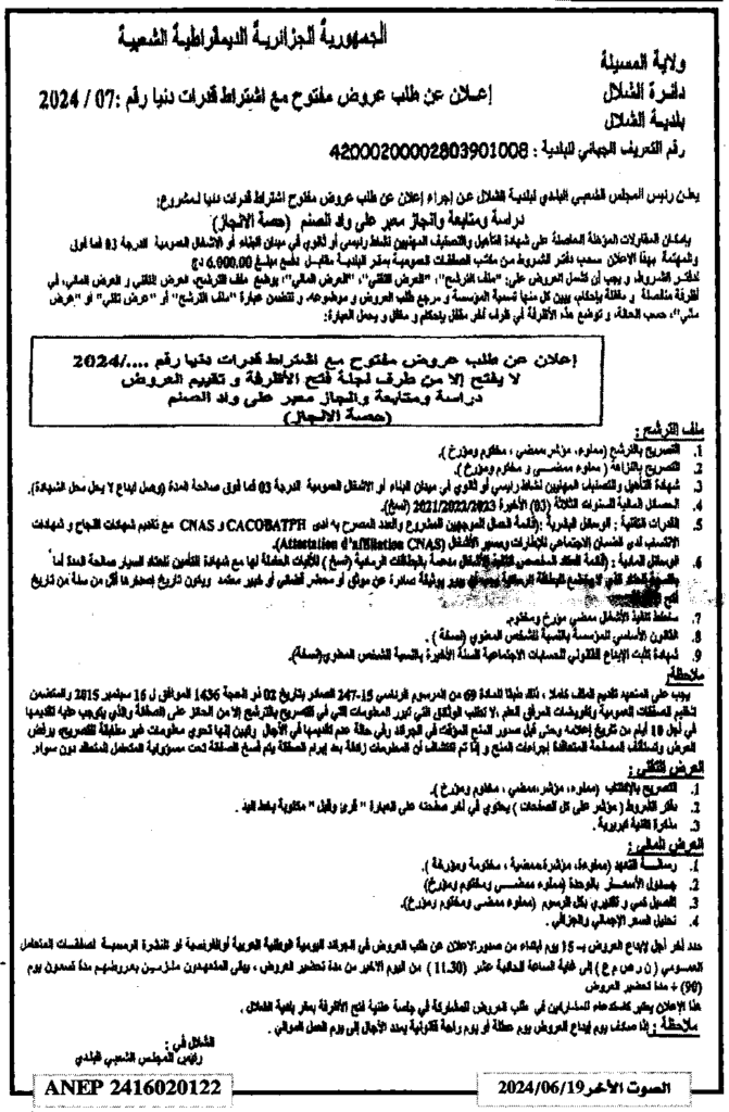 إعلان عن طلب عروض مفتوح 2024/07 بلدية الشلال