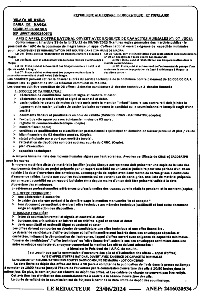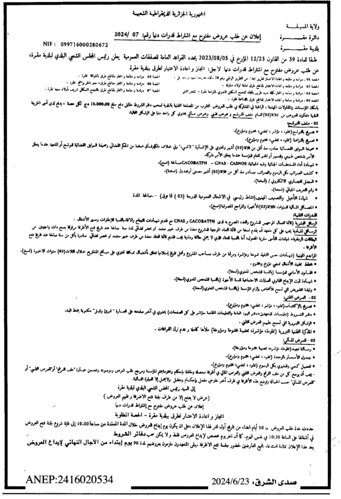 إعلان عن طلب عروض مفتوح 2024/07 بلدية مقرة