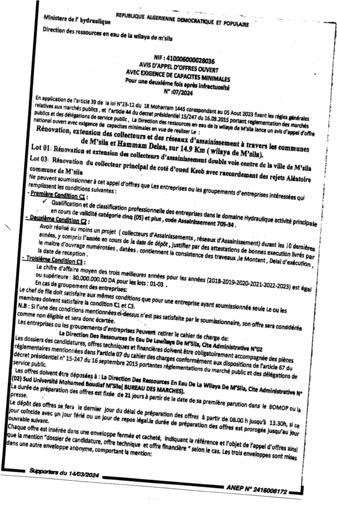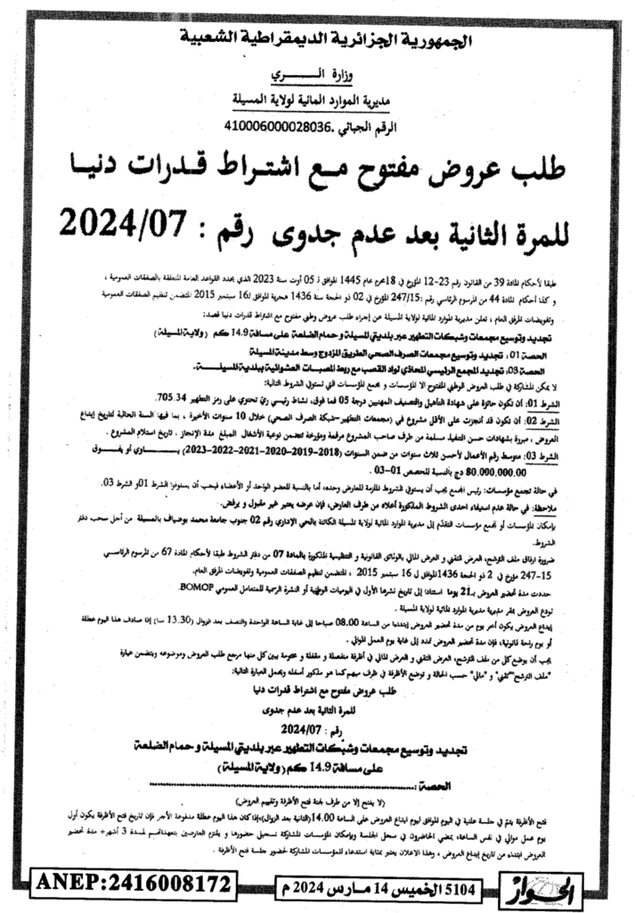 إعلان عن طلب عروض مفتوح 2024/07 للمرة الثانية بعد عدم جدوى مديرية الموارد المائية لولاية المسيلة