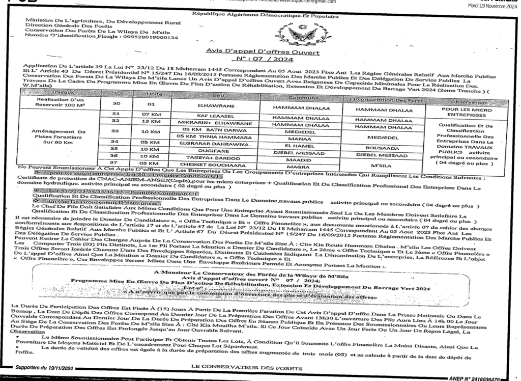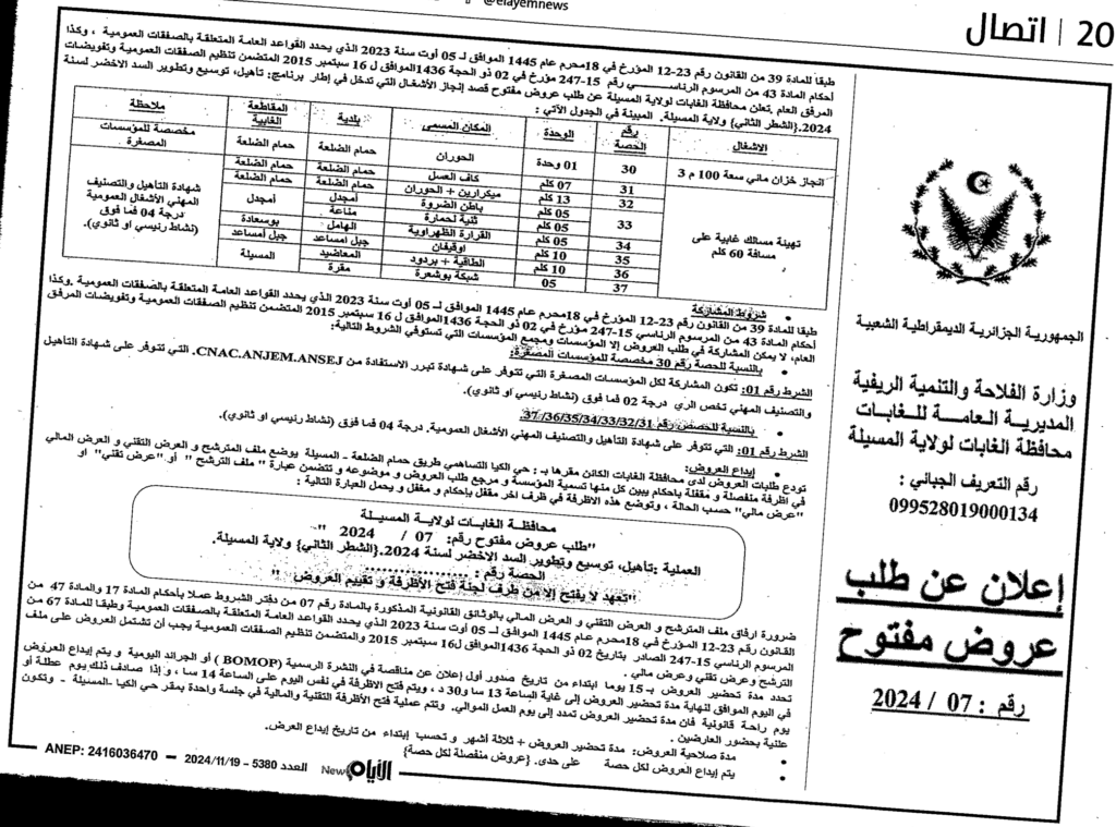 إعلان عن طلب عروض مفتوح 2024/07 محافظة الغابات لولاية المسيلة