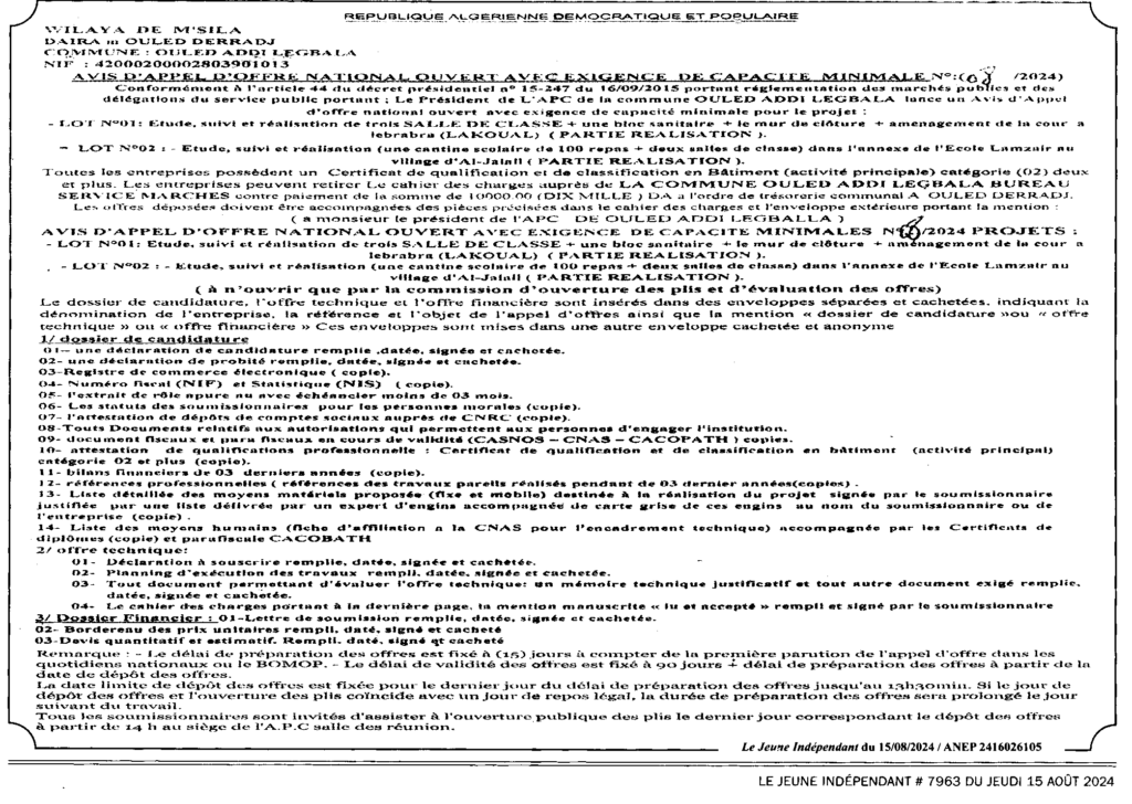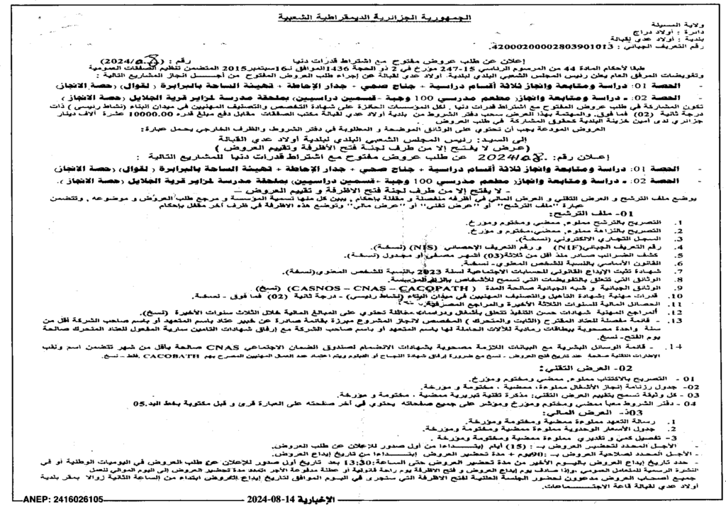 إعلان عن طلب عروض مفتوح 2024/08 بلدية أولاد عدي لقبالة