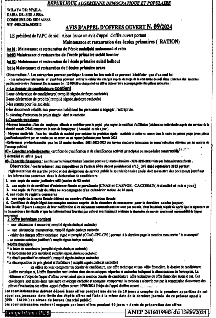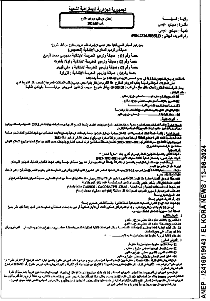 إعلان عن طلب عروض مفتوح 2024/09 سيدي عيسى