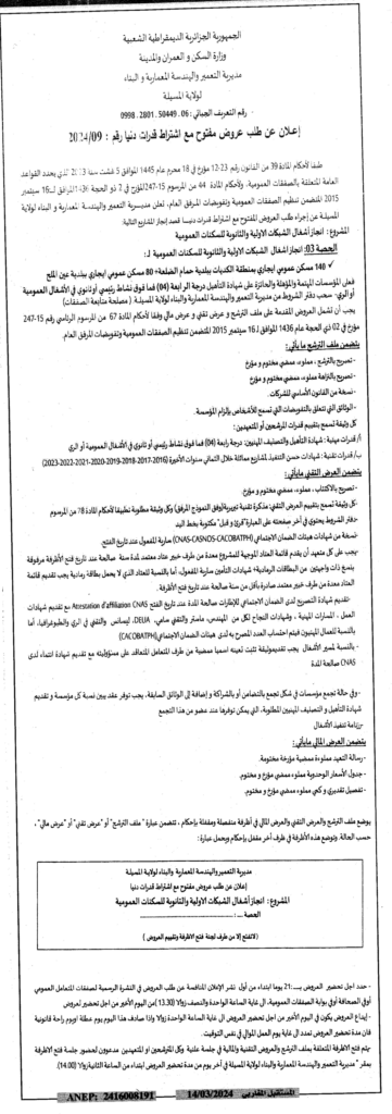 إعلان عن طلب عروض مفتوح 2024/09 مديرية التعمير والهندسة المعمارية والبناء لولاية المسيلة