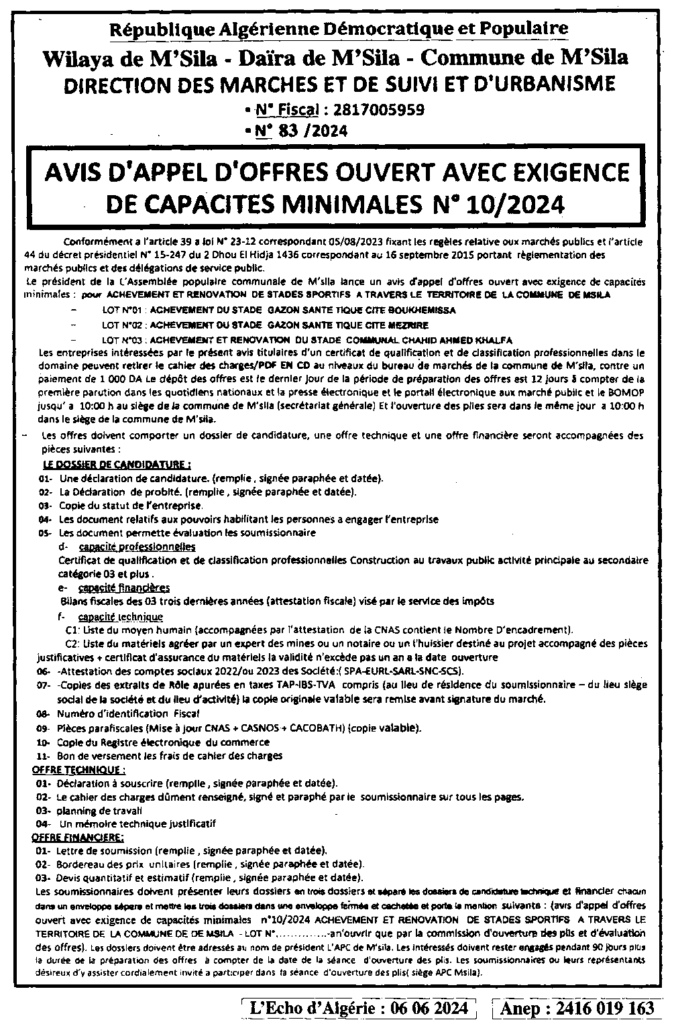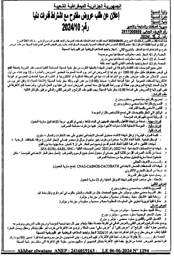 إعلان عن طلب عروض مفتوح 2024/10 بلدية المسيلة