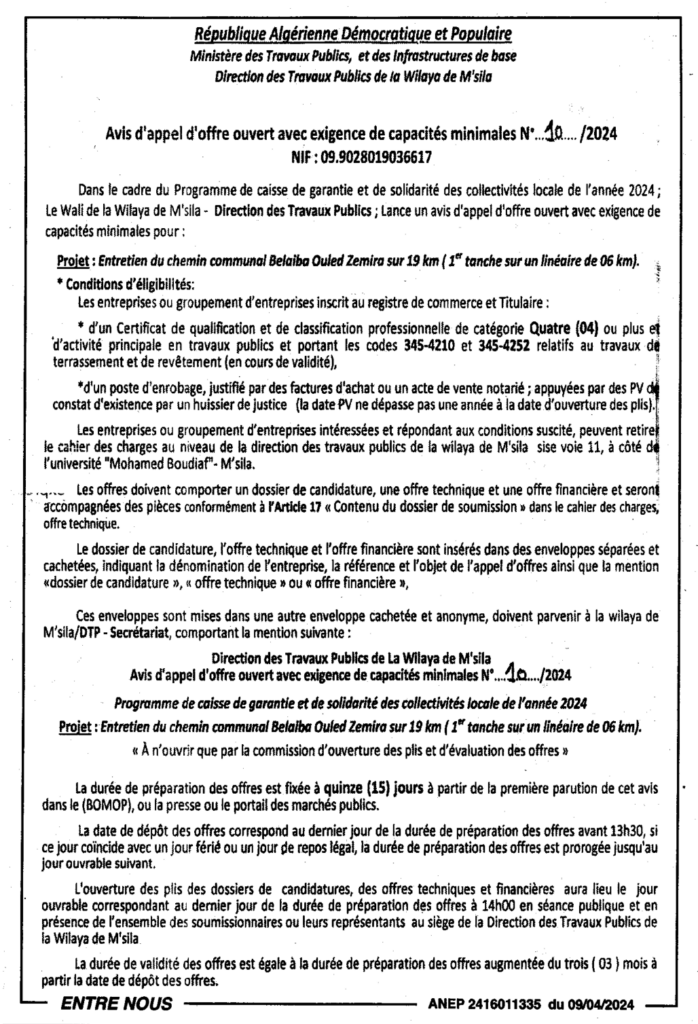 إعلان عن طلب عروض مفتوح 2024/10 مديرية الأشغال العمومية لولاية المسيلة