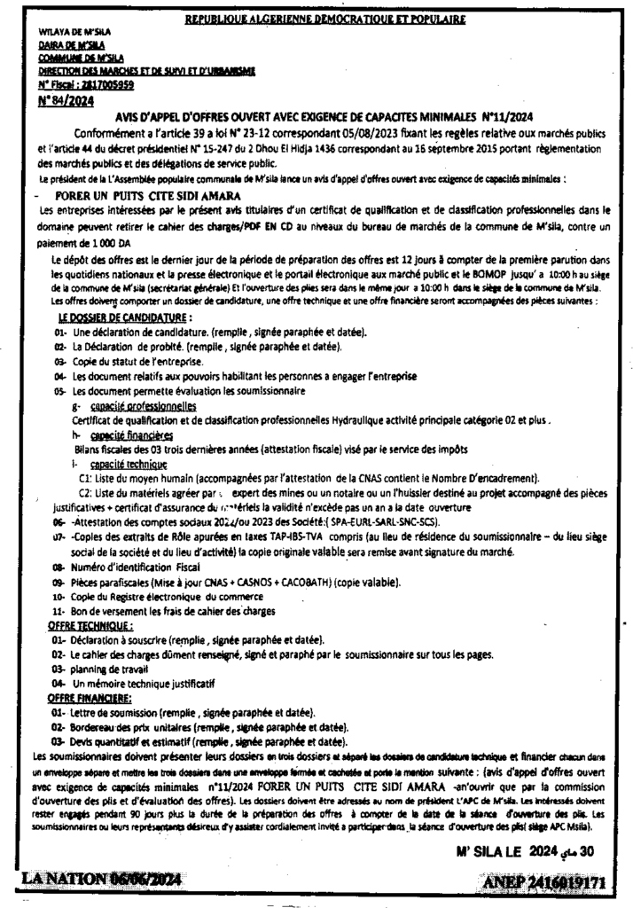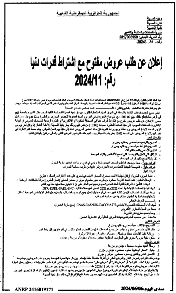 إعلان عن طلب عروض مفتوح 2024/11 بلدية المسيلة