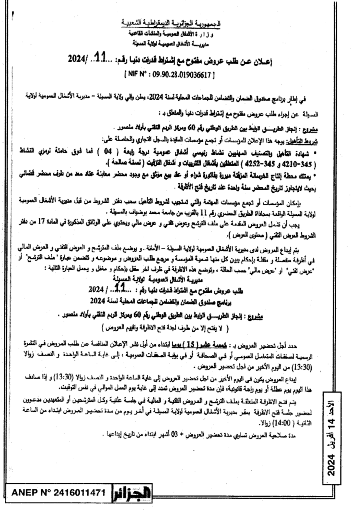 إعلان عن طلب عروض مفتوح 2024/11 مديرية الأشغال العمومية لولاية المسيلة