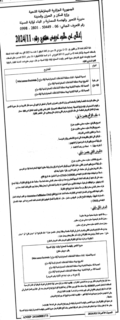 إعلان عن طلب عروض مفتوح 2024/11 مديرية التعمير والهندسة المعمارية والبناء لولاية المسيلة