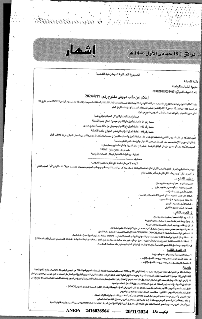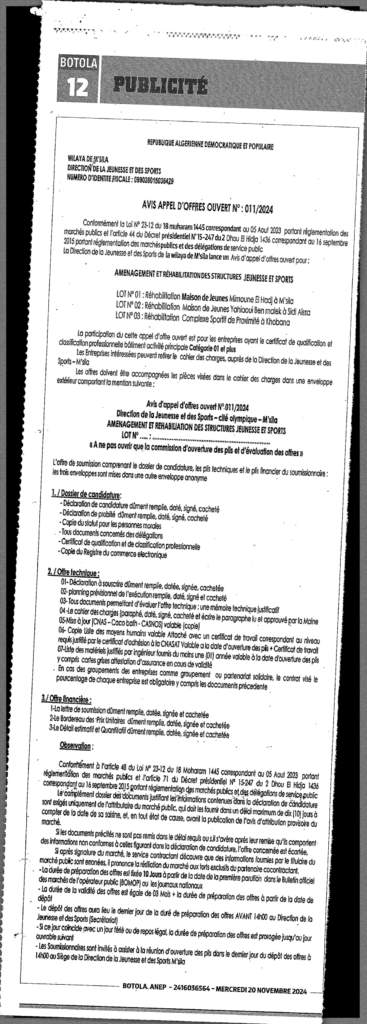 إعلان عن طلب عروض مفتوح 2024/11 مديرية الشباب والرياضة لولاية المسيلة