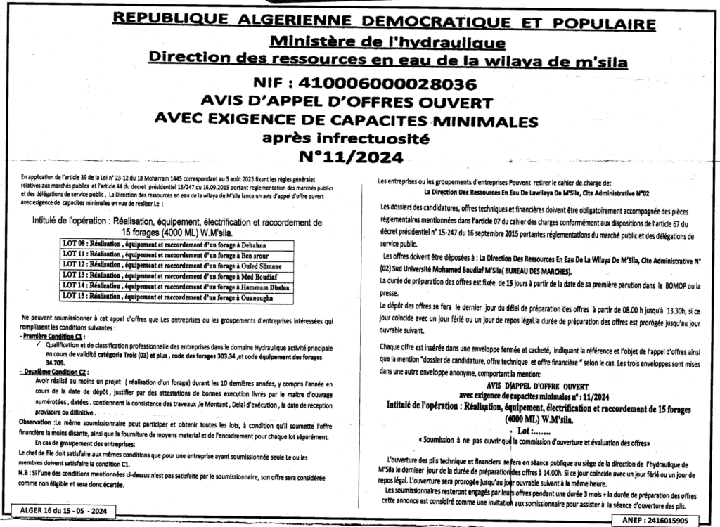 إعلان عن طلب عروض مفتوح 2024/11 مديرية الموارد المائية لولاية المسيلة
