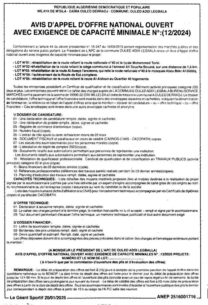 إعلان عن طلب عروض مفتوح 2024/12 بلدية اولاد عدي لقبالة