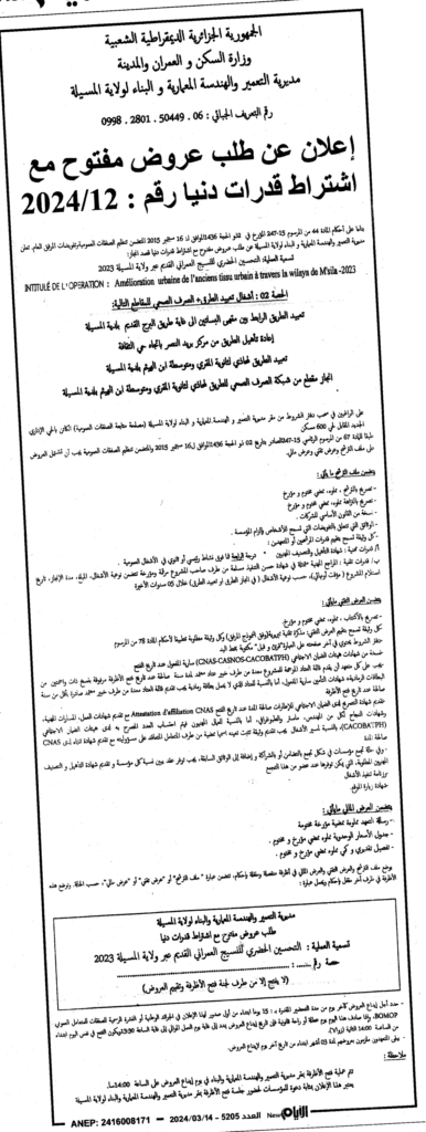 إعلان عن طلب عروض مفتوح 2024/12 مديرية التعمير والهندسة المعمارية والبناء لولاية المسيلة