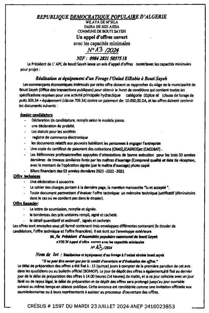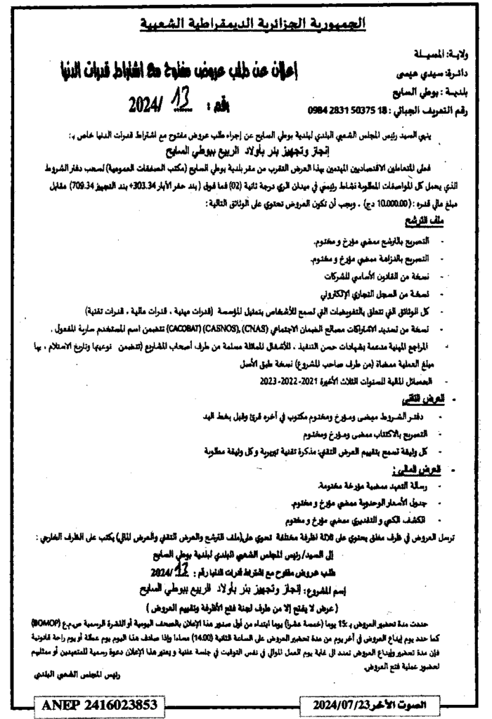 إعلان عن طلب عروض مفتوح 2024/13 بلدية بوطي السايح