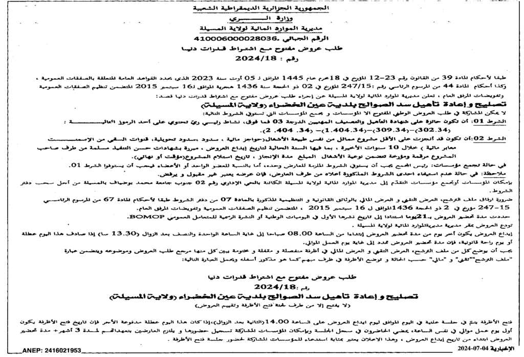 إعلان عن طلب عروض مفتوح 2024/18 مديرية الموارد المائية لولاية المسيلة