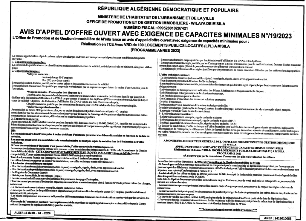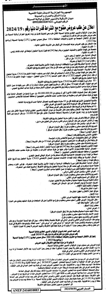 إعلان عن طلب عروض مفتوح 2024/19 ديوان الترقية والتسيير العقاري لولاية المسيلة