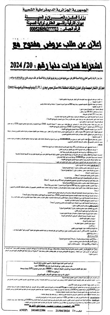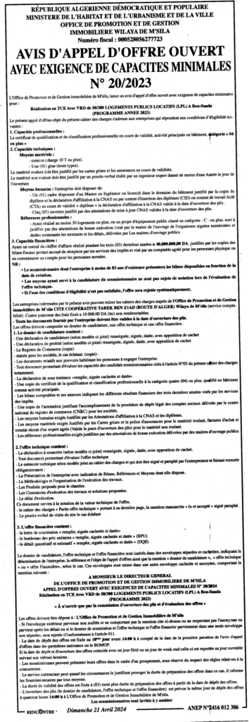 إعلان عن طلب عروض مفتوح 2024/20 ديوان الترقية والتسيير العقاري لولاية المسيلة