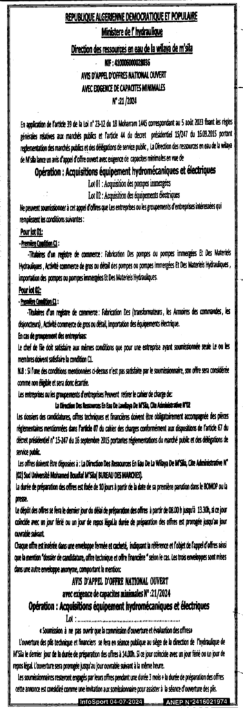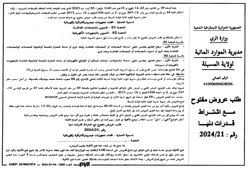 إعلان عن طلب عروض مفتوح 2024/21 مديرية الموارد المائية لولاية المسيلة