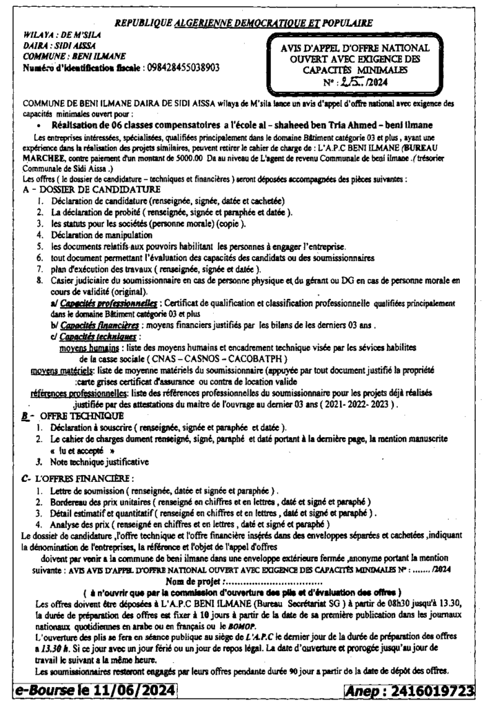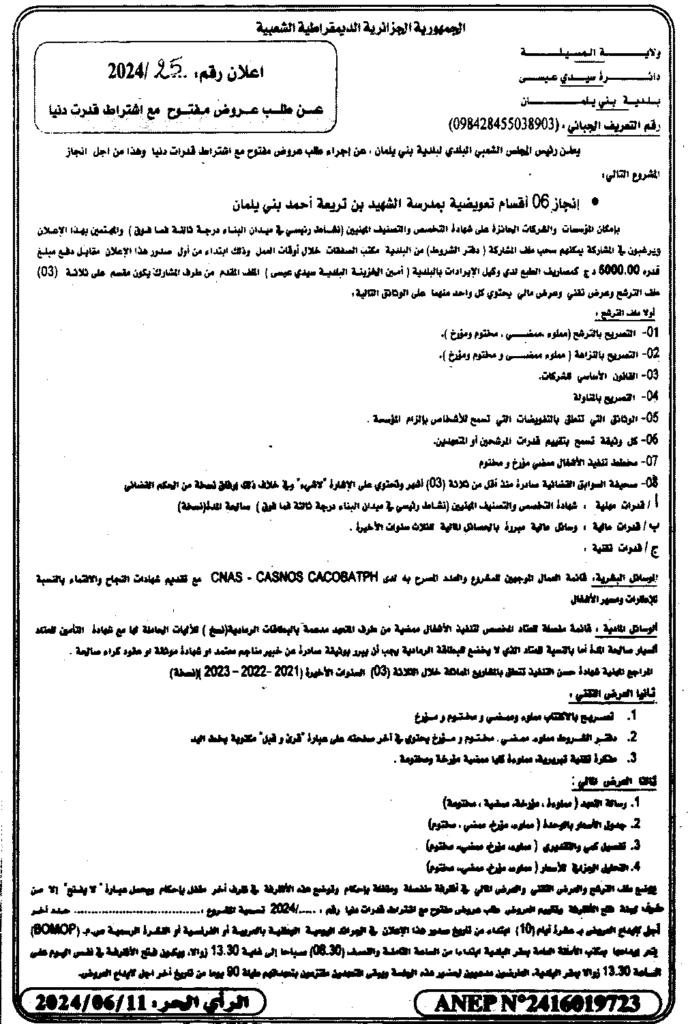 إعلان عن طلب عروض مفتوح 2024/25 بلدية بني يلمان