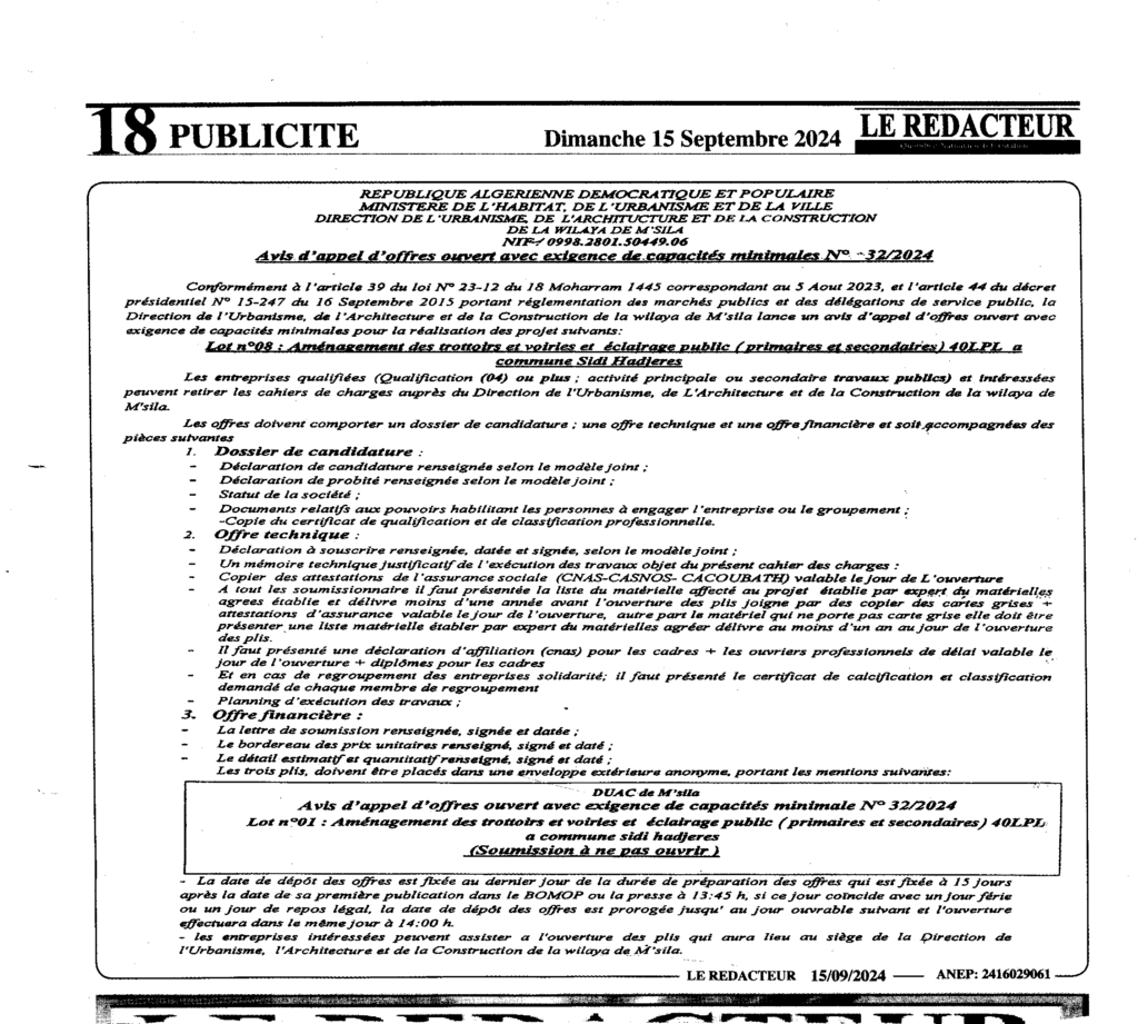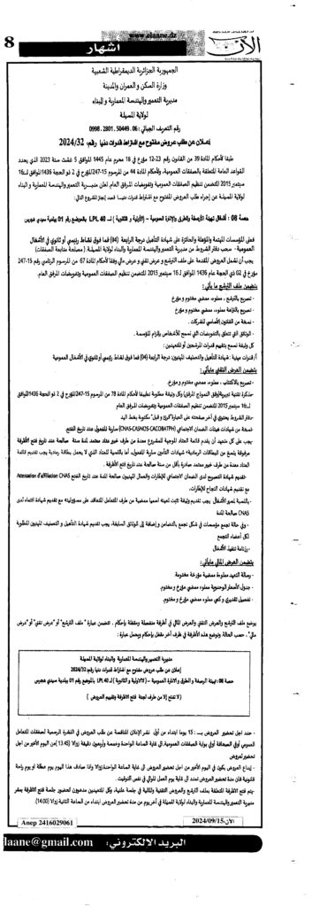 إعلان عن طلب عروض مفتوح 2024/32 مديرية التعمير والهندسة المعمارية والبناء لولاية المسيلة