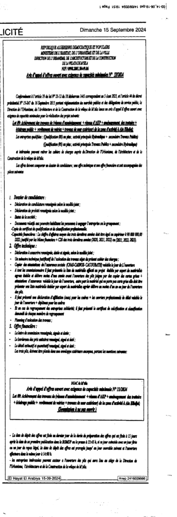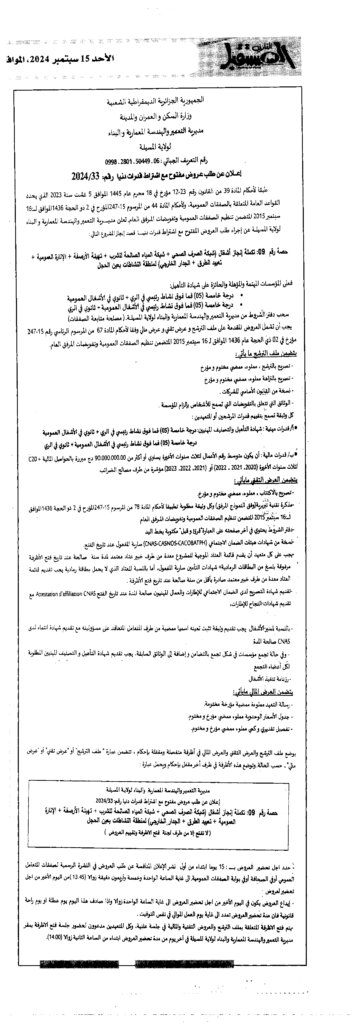 إعلان عن طلب عروض مفتوح 2024/33 مديرية التعمير والهندسة المعمارية والبناء لولاية المسيلة