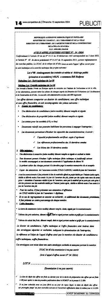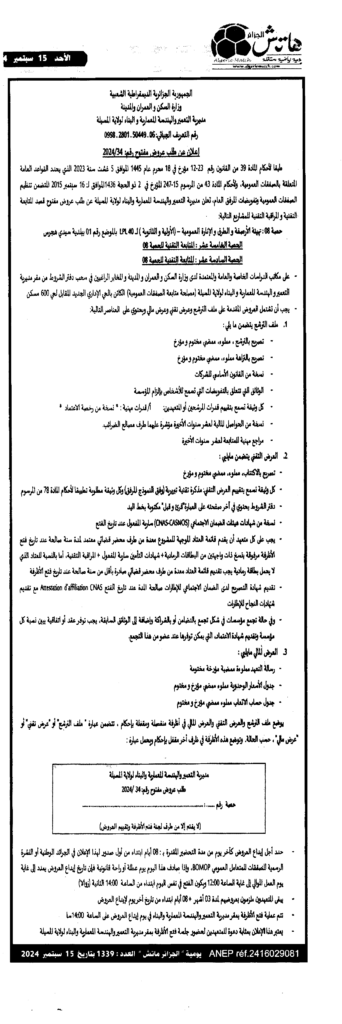 إعلان عن طلب عروض مفتوح 2024/34 مديرية التعمير والهندسة المعمارية والبناء لولاية المسيلة