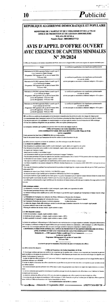 إعلان عن طلب عروض مفتوح 2024/39 ديوان الترقية والتسيير العقاري لولاية المسيلة