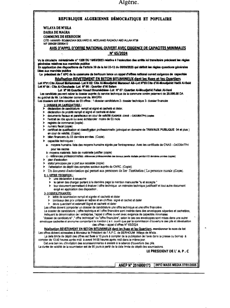 إعلان عن طلب عروض مفتوح 2024/65 بلدية برهوم