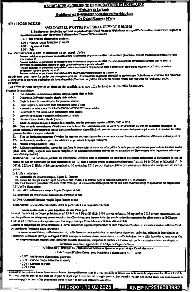 إعلان عن طلب عروض مفتوح 2025/01 المؤسسة الاستشفائية أولاد منصور