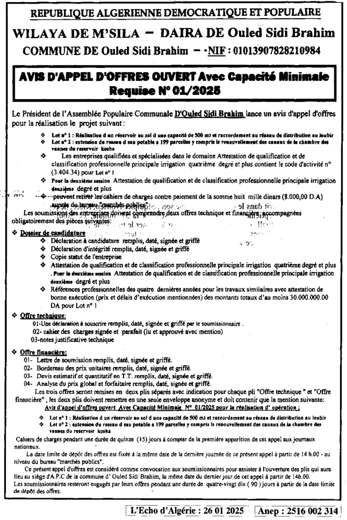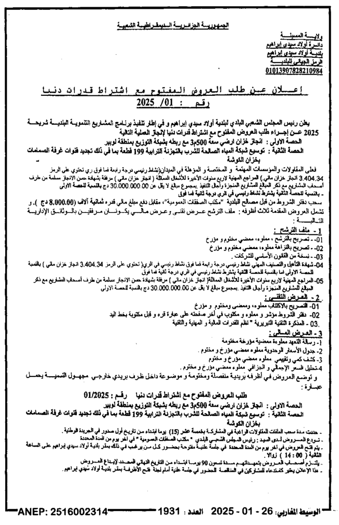 إعلان عن طلب عروض مفتوح 2025/01 بلدية أولاد سيدي ابراهيم
