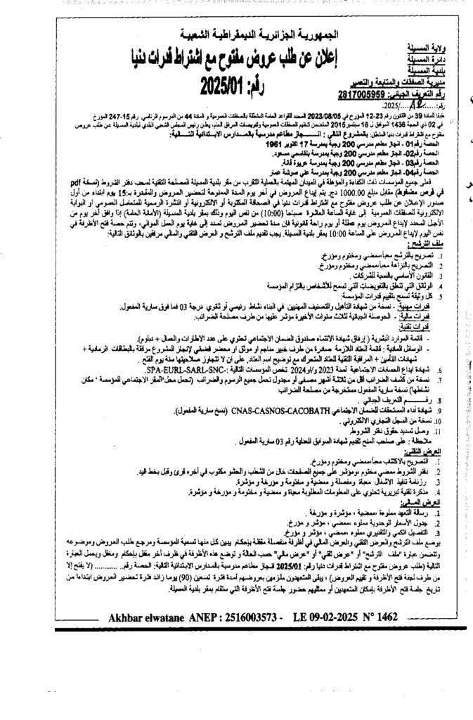 إعلان عن طلب عروض مفتوح 2025/01 بلدية المسيلة