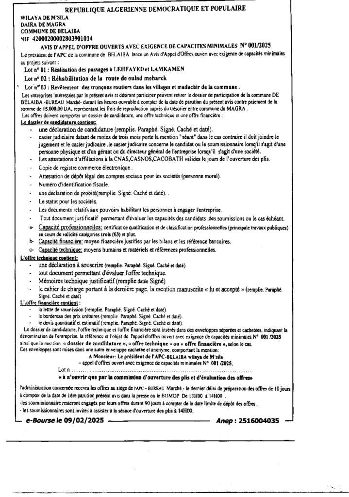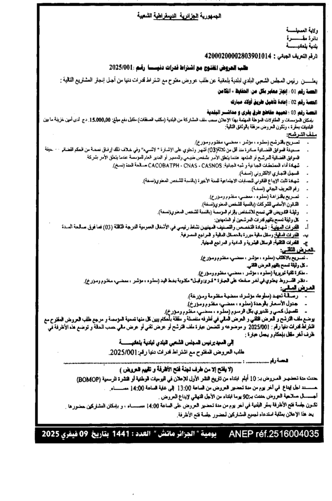 إعلان عن طلب عروض مفتوح 2025/01 بلدية بلعايبة