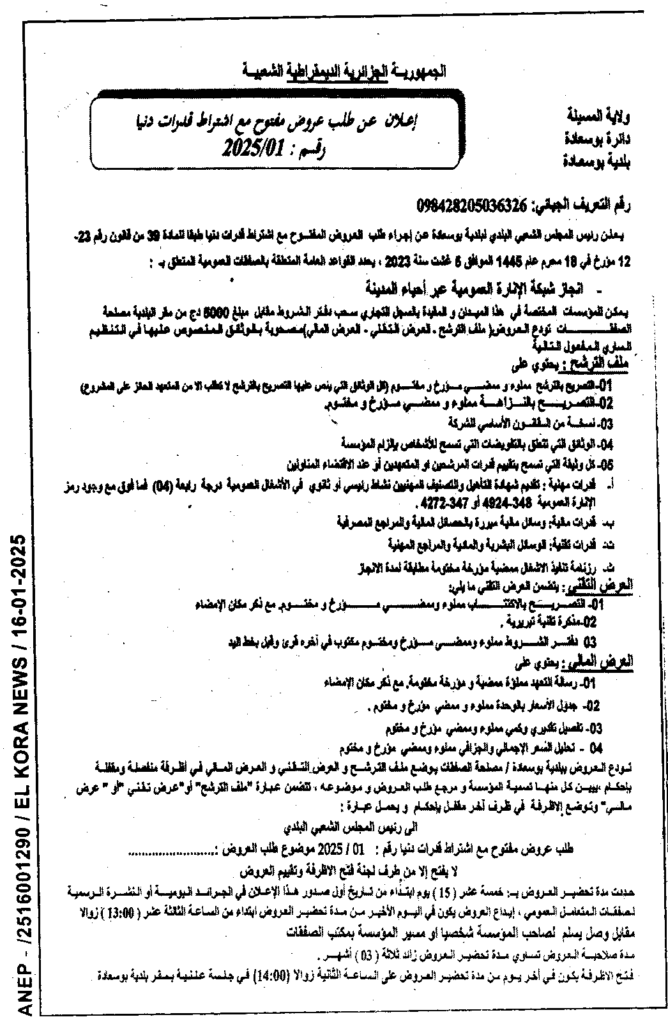 إعلان عن طلب عروض مفتوح 2025/01 بلدية بوسعادة