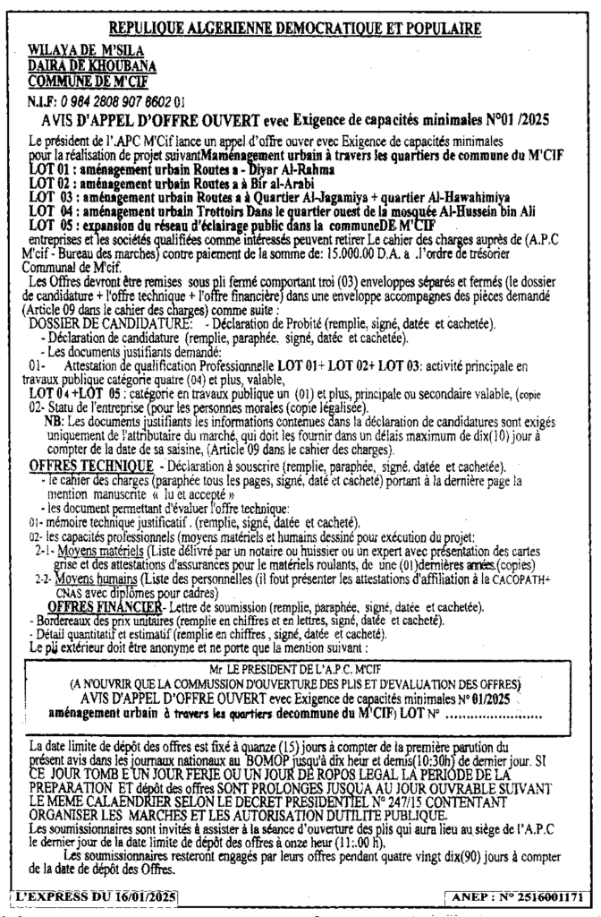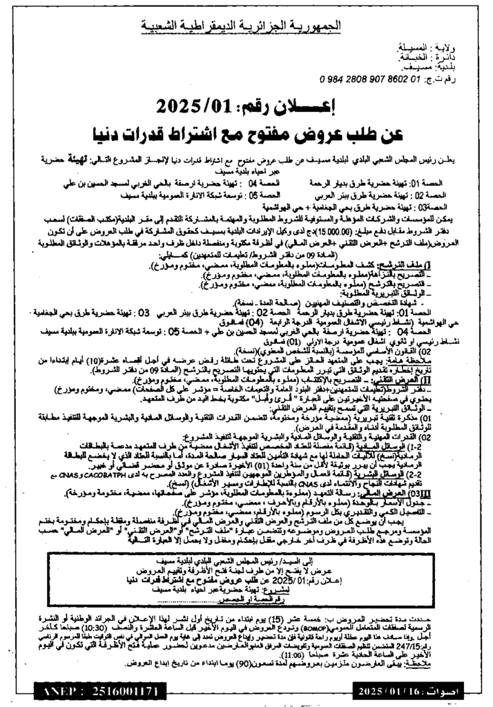 إعلان عن طلب عروض مفتوح 2025/01 بلدية مسيف