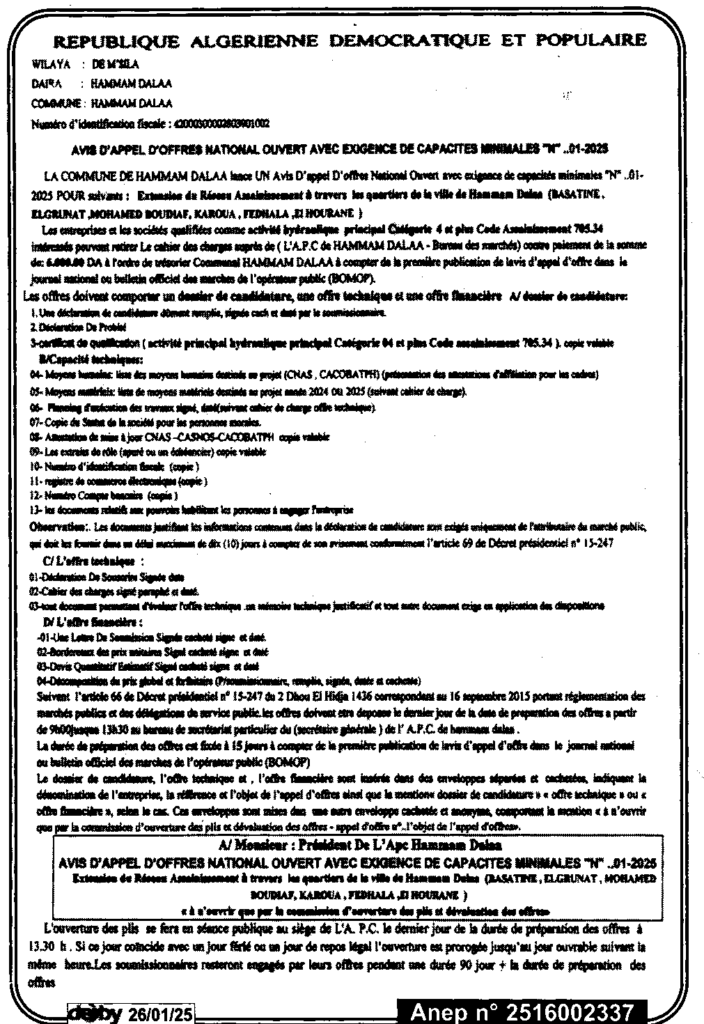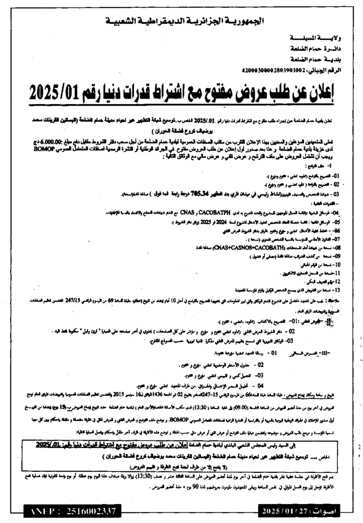 إعلان عن طلب عروض مفتوح 2025/01 حمام الضلعة