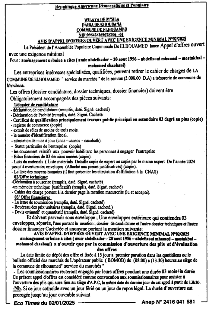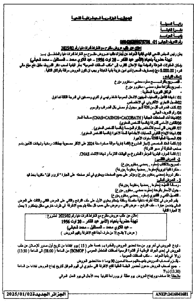 إعلان عن طلب عروض مفتوح 2025/02 بلدية الحوامد