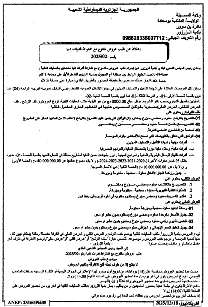 إعلان عن طلب عروض مفتوح 2025/02 بلدية الزرزور