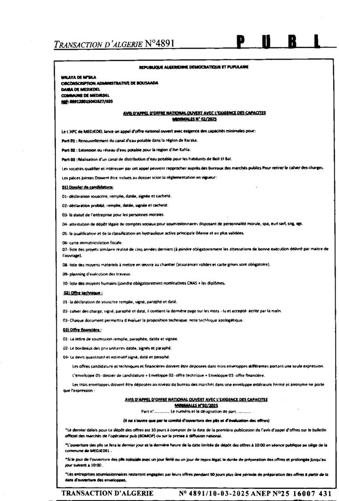 إعلان عن طلب عروض مفتوح 2025/02 بلدية امجدل