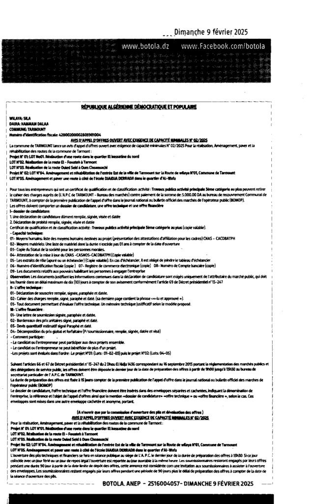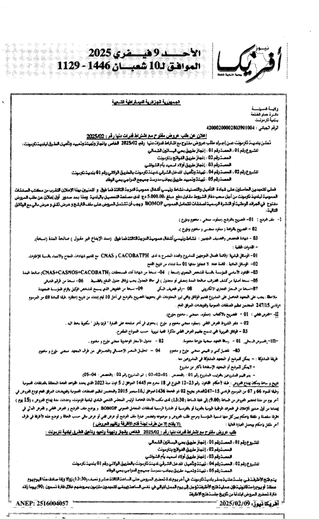 إعلان عن طلب عروض مفتوح 2025/02 بلدية تارمونت
