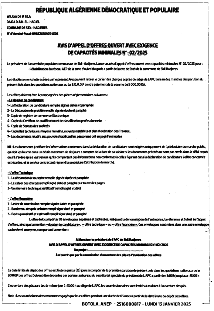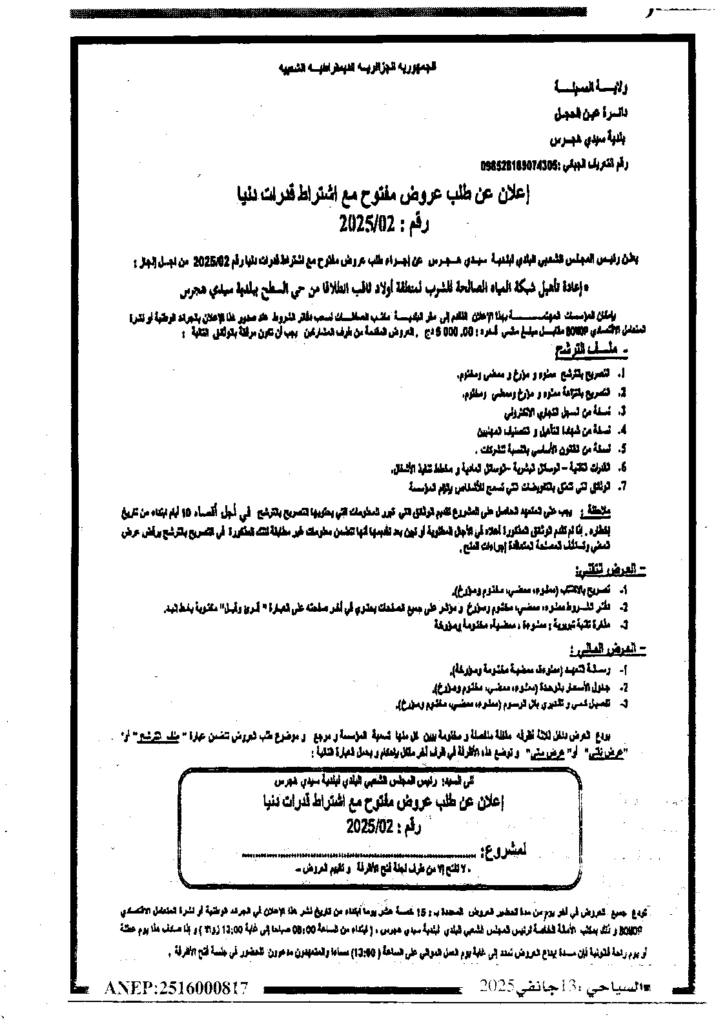 إعلان عن طلب عروض مفتوح 2025/02 بلدية سيدي هجرس
