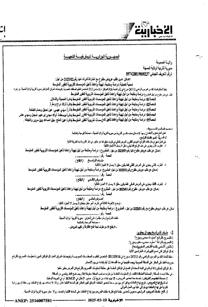 إعلان عن طلب عروض مفتوح 2025/02 مديرية التربية لولاية المسيلة