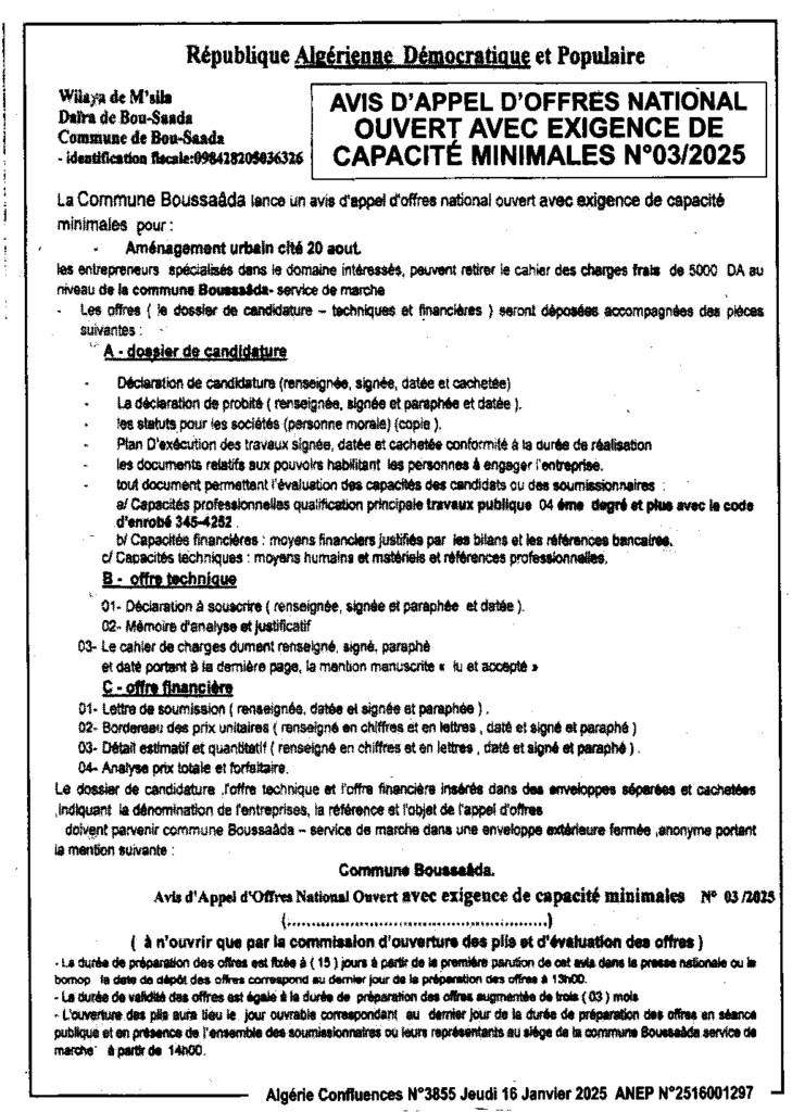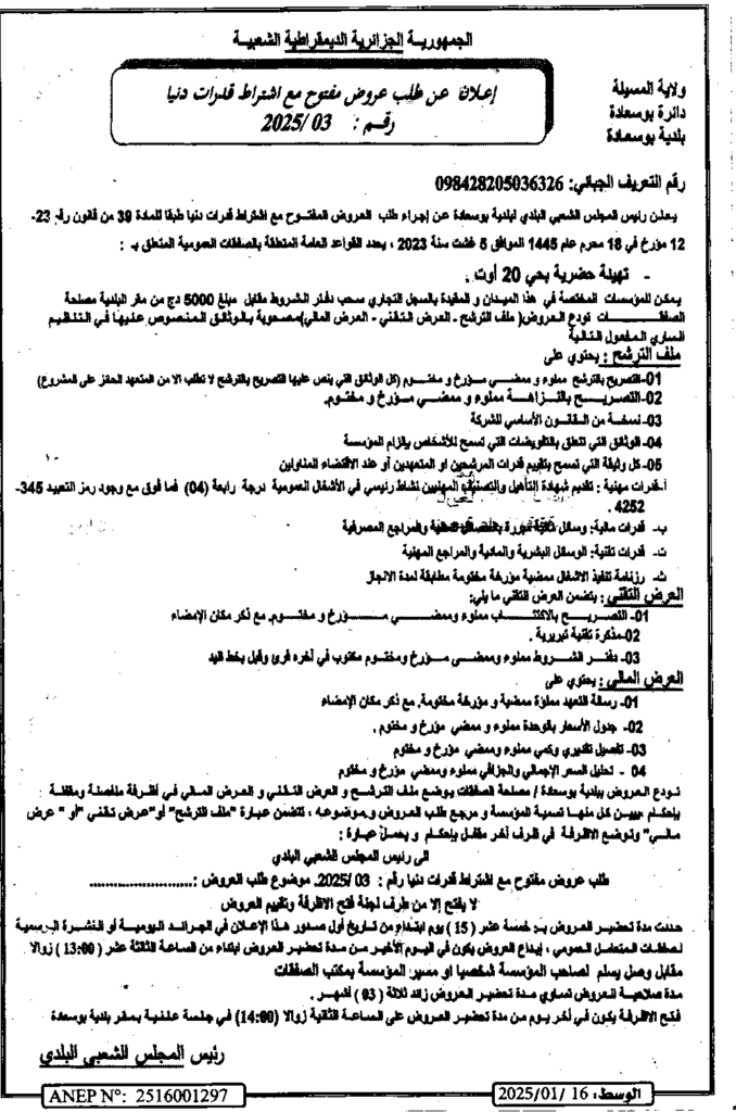 إعلان عن طلب عروض مفتوح 2025/03 بلدية بوسعادة