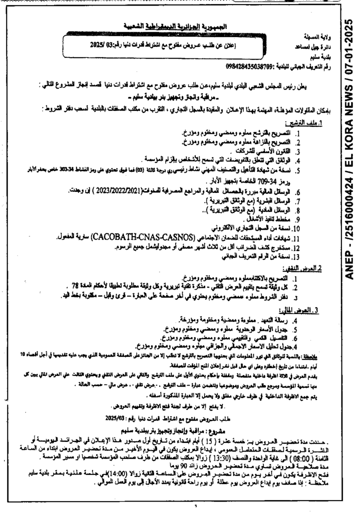 إعلان عن طلب عروض مفتوح 2025/03 بلدية سليم